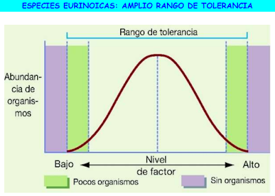 a) Especies eurioicas; se muestran poco exigentes respecto a los valores de un determinado factor, es decir, su intervalo de tolerancia a ese factor es amplio. Suelen ser especies generalistas, esto es, con gran adaptabilidad, y con alta tasa de natalidad y baja tasa de supervivencia.